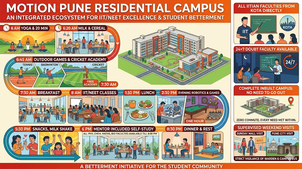 Our residential campus offers IIT faculty-led classes, 24/7 doubt support, and a balanced routine with yoga, sports, robotics, and self-study.
