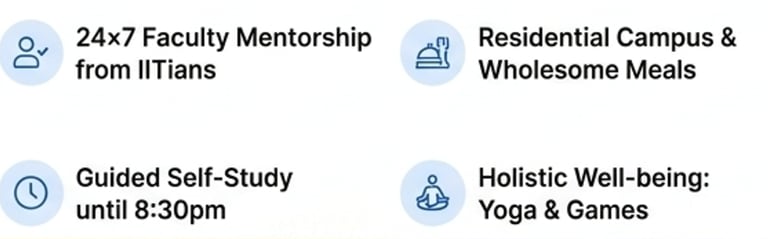 Inbuilt campus with yoga, games, meals, and IIT faculty guidance all day.